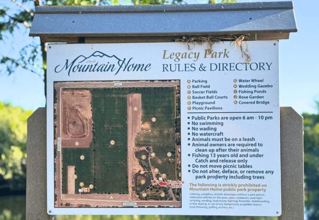 Legacy Park sits on the east side of Mountain Home at N 3rd E Street & E McMurtrey Road—about five minutes from downtown and 12 miles northwest of Mountain Home AFB. Enter “Legacy Park, Mountain Home, ID 83647” into your maps app or follow the brown “City Parks” signs once you reach town. Free parking rings the north and west edges of the park, and overflow space is available on nearby residential streets.